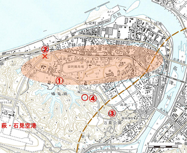 - 万葉公園内の「人麻呂展望広場」と間歩の呑み口(○)