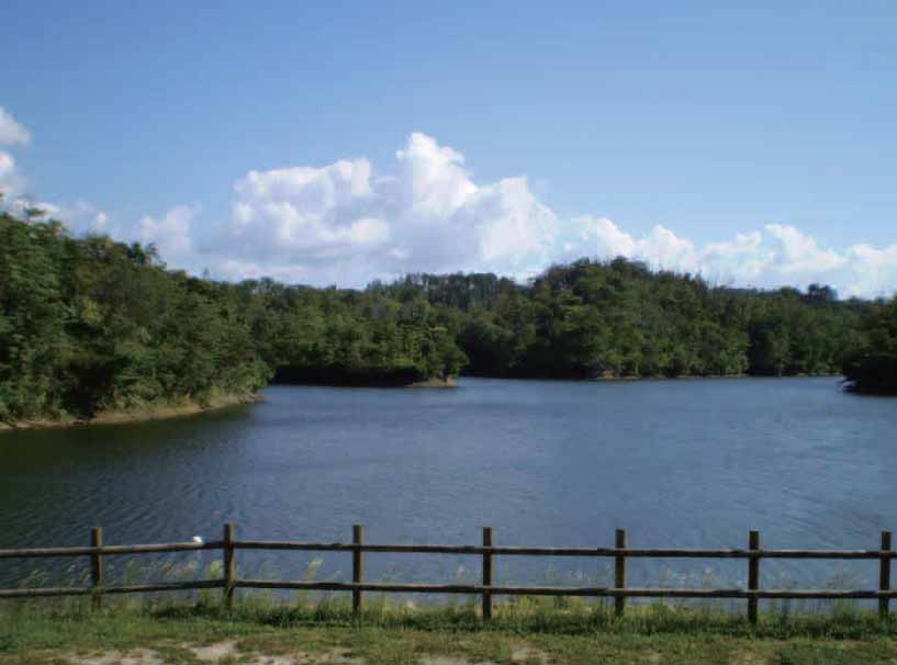 益田市街地西方の郊外には,標高50~60mの丘陵地が広がっています.この丘陵地を削り込んだ谷筋を埋めるように,豊かな水を湛えた蟠竜湖があります(写真1).湖の面積は13haで最大水深は10m程度といわれ,湖岸線は複雑に屈曲し変化に富んだ景観を見せています.龍が蟠(わだかま)っている(とぐろを巻く,複雑に絡み合っている)ような湖岸の形状から,蟠竜湖と名付けられたそうです.西側の上湖と東側の下湖の二つの湖が並んでおり,それらをつなぐように周回できる散策道が整備されています.