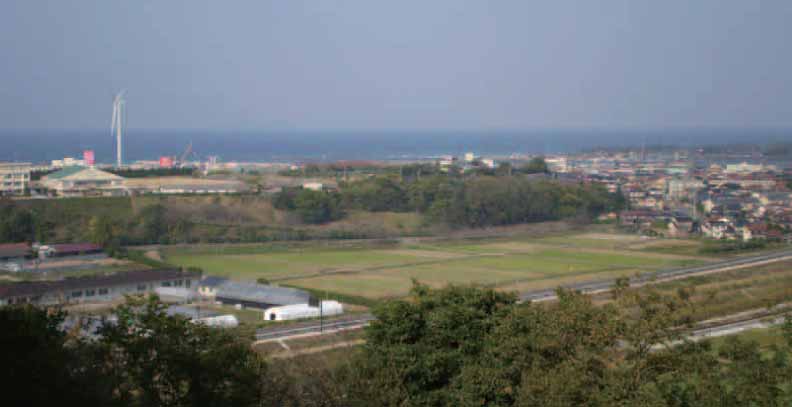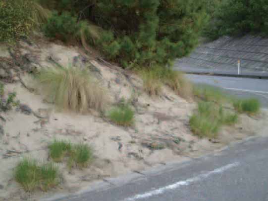 蟠竜湖は,海岸からの飛砂(写真2)がたまってできた砂丘が,谷の出口を塞いだことによってできた堰止(せきと)め湖です.その砂丘は,蟠竜湖西側の萩・石見空港に行く県道付近から,旧益田競馬場や高等学校,中学校を経て高津川左岸付近までの2km以上にわたって,幅500mほどで海岸線とわずかに斜行するように連なっています.万葉公園内の「子供の広場」からは,砂丘の様子を展望することができます(写真3).