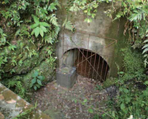 下湖の奥まった北側湖岸から,丘陵をくり貫いて写真3の水田地帯に至る灌漑用の水路トンネルがあります.今は「蟠竜湖疎水」とよばれていますが,地元高津の庄屋であった長嶺嘉左衛門の手によって宝永4年(1707年)に完成した間歩(まぶ)です.それ以来,この地区が旱魃にみまわれたことはないそうです.間歩は両坑口付近を除いて幅0.45~0.6m,高さ1.8~3.6mの素掘りのトンネルで,全長は約200mです.写真4は蟠竜湖側の間歩の口の様子です.