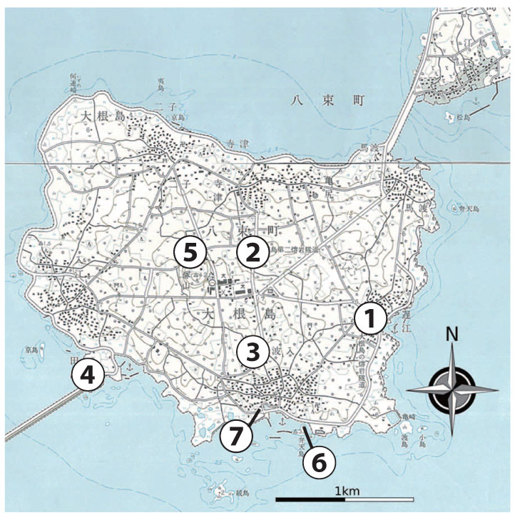大根島の周縁部においては、中海の侵食作用で溶岩が洗い出された露頭を観察できます。これらの露頭や、島根地質百選「大根島の溶岩トンネル」で紹介する二つの溶岩トンネルでは様々な溶岩や火山地形を観察することができます。 大根島波入の海岸の弁天島付近では、柱状節理、テュムラス、淡水レンズの観察ができます。 弁天島付近の海岸には六角形または五角形の割れ目で直立した玄武岩がみられます(写真3)。この割れ目は玄武岩溶岩が徐々に冷却する際の体積収縮によって生じた柱状節理と呼ばれる割れ目で、一般に溶岩の広がり方向に直交する方向に生じています。大根島では溶岩は緩い勾配で流れていますから、柱状節理は直立した状態で観察できます。 また、弁天島の南東の海岸には、海水面すれすれのところに円形の岩礁がみられます(写真4)。これは、溶岩が火山ガスなどの圧力でドーム状に盛り上がる「テュムラス」と呼ばれる火山地形が侵食されたものと考えられています。波が穏やかなときには、岩礁づたいに行って観察することもできます。 この弁天島付近など大根島縁辺部には湧泉がみられます(写真5)。弁天島付近では、海面とほぼ同標高の淡水を湛えた池が海岸からわずか数メートルのところに観察できます。大根島の地下にたまった淡水は、中海の汽水とは混ざりにくく、レンズ状に島の内部に押し込められた形で分布していると考えられています。これを淡水レンズと呼びます。この湧泉のひとつに島根県の名水百選に指定された「波入の湧水(はにゅうのかわ)」が知られています。 玄武岩溶岩が流れる際、その表面が縄状になったものを「縄状溶岩(パホイホイ溶岩)」といい、溶岩から発泡したガスが溶岩流の上面や下面に溜まり、溶岩の流動とともにバラバラになった構造を伴うアア溶岩といいますが、溶岩トンネルや溶岩庭園などで観察できます。 アクセスJR松江駅より松江市営バス八束町行きで40分 JR松江駅より自家用車で20分 関連する情報澤田順弘・新部一太郎・星川和夫 (2007) 「大根島のおいたちと洞窟生物」、松江市ふるさと文庫2、 松江市教育委員会 由志園 :https://www.yuushien.com/ 大根島本陣 : 本陣の溶岩庭園ではパホイホイ溶岩や小規模な溶岩トンネルが観察できます。 大根島の溶岩トンネル:島根地質百選「大根島の溶岩トンネル」をご利用ください。 天然記念物などの指定情報「大根島の熔岩隧道」(幽鬼洞)は国指定の特別天然記念物に、 地質学的な意義大根島を構成する玄武岩溶岩は今からおよそ20万年前の中期更新世の火山活動で形成されたものです。当時は現在よりも寒冷な気候下にあり、陸上での氷河の発達等があったため、海水準は現在よりも60m以上低かったようです。大根島の玄武岩は海水準の低下した時期に陸上に噴出した溶岩で構成されており、溶岩の基底はほぼ平らであり、その厚さは中央の大塚山部分を除き60~70mとなっています。 |
