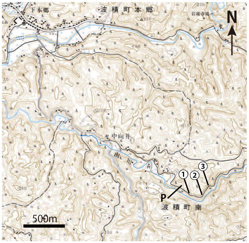 [みどころ | 交通 | 関連情報 | 指定 | 地質学的な意義] みどころ島根県の益田から浜田にかけての地域には三郡変成岩(周防変成岩)とよばれる地下深くの高圧のもとでできた変成岩が分布しています。JR山陰本線浅利駅東方約7 kmの南川に沿う道路の切り割りには、ある面に沿ってペラプラと剥げやすい性質をもった結晶片岩とよばれる変成岩が見られます。中向井(から東南東方向へ向かう道路が大きく左に屈曲するところ(道路の右側にカーブミラーがあります)からその手前約250mの地点にかけて道路沿いに濃い青色から藍色をした岩石があらわれています。この岩石は青色片岩とよばれる変成岩の一種です。この青色片岩を薄く削って岩石観察用の顕微鏡(偏光顕微鏡)で見ると写真3のように青色をした細長い鉱物がたくさん含まれています。これは藍閃石という角閃石の仲間の鉱物で、角閃石の中ではカルシウムが少なくナトリウムを多くふくむ化学的特徴があります。藍閃石は高圧で低温の条件でのみできる特殊な角閃石です。青色片岩はもともとは海底にたまった玄武岩質の岩石と考えられています。この岩石が地下深くの高圧で低温の条件におかれてできたのが青色片岩です。 カーブミラーのところからおよそ20 m北東方向へ行くと、こんどは数mmごとに白黒の縞が繰り返している岩石が見られます(地点(2))。これは泥質片岩とよばれる変成岩で、もともとは海底にたまった泥岩と考えられています。さらに道路をおよそ150 m行くと、表面は褐色ですが、ハンマーなどで割って内部を見ると淡い緑色をした変成岩が約40 mにわたって見られます(地点(3))。この変成岩は緑色片岩とよばれます。緑色片岩が緑っぽい色をしているのは、この岩石の中にアクチノ閃石という緑色をした角閃石がたくさん含まれているからです。このがけをよく見ると、緑色片岩の中に先ほどの青色片岩の薄層がはさまれているのをみつけることができます。緑色片岩ももともとは玄武岩質の岩石ですが、青色片岩とは化学組成が少し異なっていたと考えられます。 アクセスJR浅利駅より石見交通バスで「波積」へ。ここから南方へ都治川の橋をわたり、中向井経由で青色片岩のがけ(地点(1))まで約4 km、 1時間。バスの便は朝夕と昼に数本ずつしかないので事前にダイヤを確認の上、利用する必要があります。 自家用車利用の場合は、JR三江線川平駅付近から東方へ上津井、四熊、中向井を経由して青色片岩がけまで約16 km。国道9号線浅利から東方へ、中都治、上都治、下本郷、中向井経由で青色片岩のがけまで約10 km。いずれのルートも道路の狭いところがあるので、運転には注意が必要です。また、駐車スペースは青色片岩露頭手前道路脇〈地図のP地点付近〉に、小型の乗用車1、2台分しかありません。 関連する情報参考図書:高須 晃・千貫 浩(1998〉江津の三郡変成岩.「島根の自然」編集委員会編,島根の自然をたずねて.築地書館. 天然記念物などの指定情報なし 地質学的な意義青色片岩のように藍閃石を含むような変成岩は地球上でもとりわけ地温勾配の低い場所でできたとされています。地温勾配が低いということは地下深くにもかかわらず地温があまり上がらないことを意味します。ここで見られる青色片岩は地下40 kmの深さに相当する高圧でありながら、地温は450℃ぐらいという低温の条件でできたことがわかっています。450℃が低温というのは、現在の日本列島の地温勾配からすると、地下10数kmで地温が450℃になるところがあることと比較してのことです。青色片岩ができるような地温勾配の小さい条件は、プレートテクトニクスでいう海洋プレートが大陸プレートの下に沈み込む地域にのみ見られます。ここで見られる変成岩類は、もともとは海底にたまった泥岩や玄武岩質の岩石が海洋プレートの沈み込みとともに地下およそ40 kmまで引きずり込まれ、低温高圧の条件の下で変成岩に変わったものといえます。結晶片岩をつくった海洋プレートの沈み込みは今から約1億8000万年前とされています。 |
