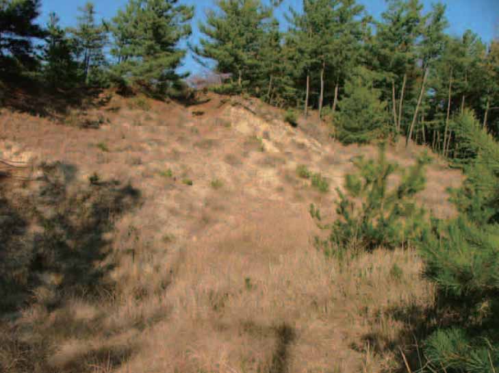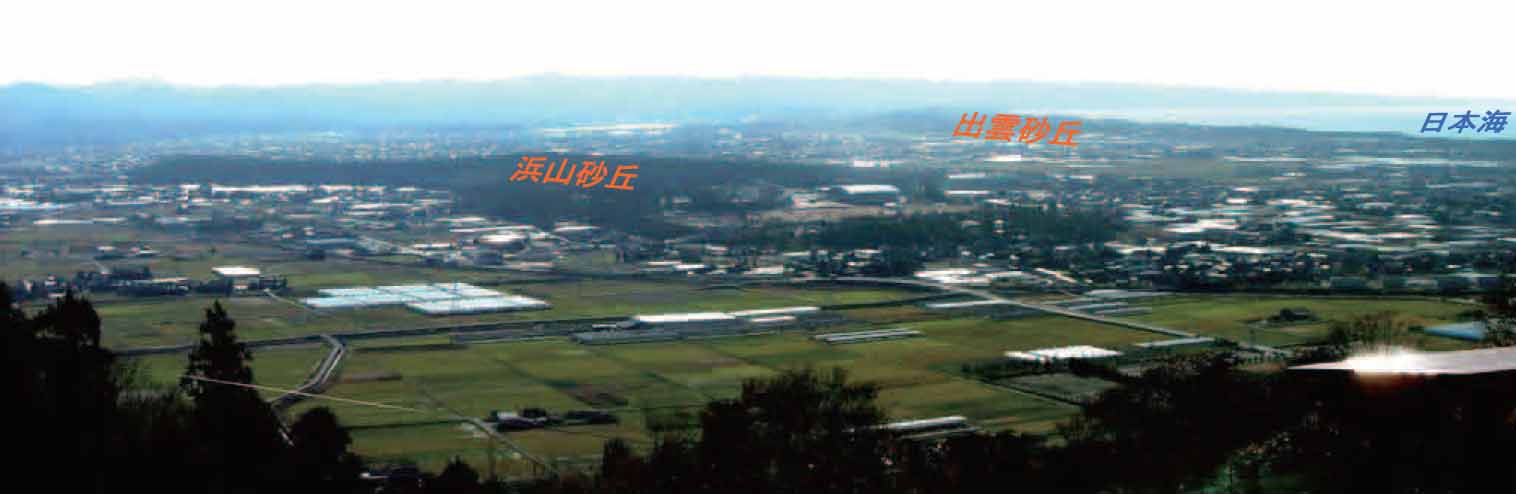 写真1:北山中腹から見た浜山砂丘 出雲平野の西端の海岸沿いには出雲砂丘が南北に細長く分布しています。浜山砂丘はこの出雲砂丘から約2.5km東の平野の中に位置し、南北約2.5km,東西約1km,最大標高41mの丘陵を形成しています。浜山砂丘は、神戸川やかつて西流していた斐伊川によって運ばれてきて、海岸に堆積した大量の砂が強い西風で吹き上げられてできたものです。東斜面が急傾斜であるのに対し西斜面がなだらかな砂丘地形は、西風により砂が移動・堆積したことによるものです。 風による砂の移動が激しく、農耕の妨げになっていたため、1751年、当時は高浜砂丘と呼ばれていた浜山砂丘に井上恵助が私財を投じて黒松の植林を始め、20余年後には松林となりました。現在も浜山砂丘の大部分は松で覆われていますが、北側は島根県立浜山運動公園として競技場や体育館が整備されているほか、松林の中にも遊歩道やアスレチックが設けられています。西側の緩斜面などは宅地やブドウ畑などに利用されています。そのため、砂丘の内部を観察できる露頭はありません。 また、松が繁茂することで水持ちがよくなり、浜山砂丘の東斜面には大干ばつでも枯れない湧水が得られるようになりました。この湧水は市道浜山公園線の東側公園入り口近くの地点②にあり、砂丘の砂でろ過された地下水が、急勾配の東斜面の麓で地表に湧き出しているものです。湧水の水質は良好で「平成の名水百選」に選定されました。この湧水はカルシウムイオンと炭酸水素イオンを通常の地下水に比べてより多く含んでいるのが特徴です。現在、約50軒の住宅への簡易水道の水源として一日約300トンもの湧水が汲み上げられています。 浜山砂丘の周囲は、出雲砂丘の砂地が広がる北西側を除き、おおむね標高1~3mの低地になっています。東~北側の低地は菱根池という広い沼地でしたが、1616年からの大規模な干拓事業により現在は水田になっています。