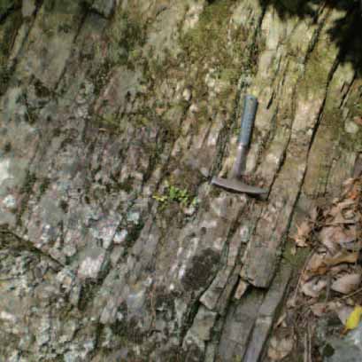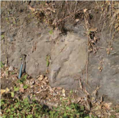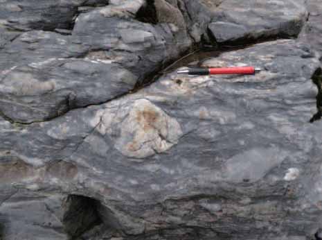 写真2:泥岩中の引き伸ばされた砂岩礫(地点2)