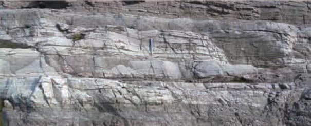 浄土ヶ浦ではこれらの地層が堆積した湖沼の環境を知る手がかりがいくつかみられます。第一は、写真に示すような緩やかな波状の縞模様が地層中にみられます。これは暴風時に深さ40m程度より浅い水底の堆積物が波で動かされてできた模様(ハンモック状斜交層理)です。このことから、この湖は浅かったことがわかります。