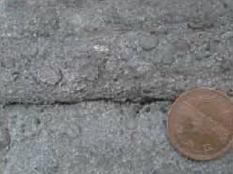 第二に、堆積物中のところどころに直径0.5~1cm程度で、灰白色の殻をもつ球状のものが多数みられます。これらは火山から大気中高く噴出した噴煙中の火山灰が何らかの原因で互いに付着してできたもので、火山豆石とよばれています。湖沼の周囲や湖底では激しい噴火活動が起きていたことが判ります。また、長径が40cm以下の大きな礫を多く含む泥岩層がありますが、これは土石流が運んできた堆積物で、湖沼の周りには土石流が発生しやすい山地があったことを示すようです。 |