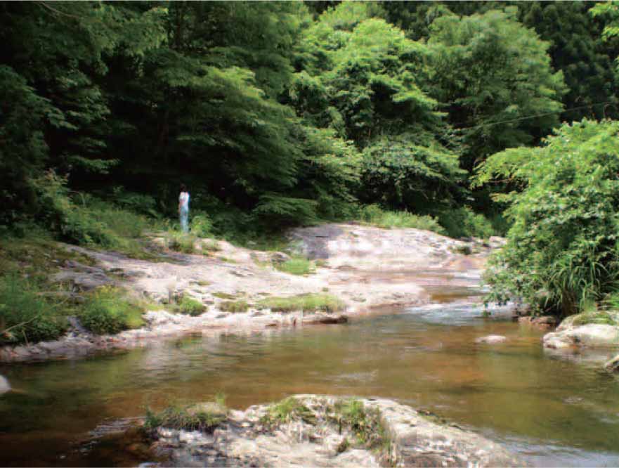 写真1:周布川の露頭の全景 周布川の最上流部は、標高800m~900mで小起伏をなす脊梁低位面(八幡高原面)を峡谷状に浸食して、北東方向にほぼ直線的な谷筋で流れ下っています。南側の流域界は広島県との県境となります。この一帯には、今から約9000万年前の中生代白亜紀の大規模な火山活動で噴出した凝灰岩や溶結凝灰岩が分布しています。これらの岩石は匹見層群と呼ばれ、県西部の吉賀町から県中央の美郷町にかけて広く分布しています。
