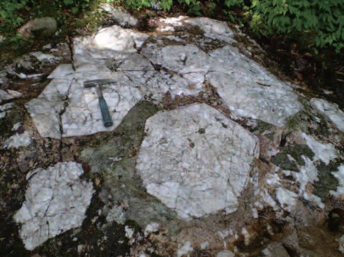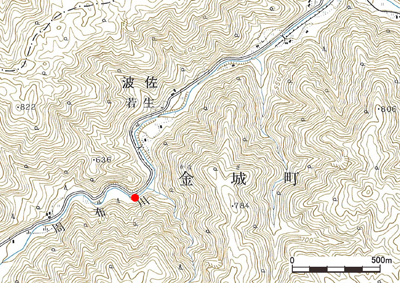 アクセス●浜田市金城町波佐若生→国道186号の金城町波佐から県道波佐芸北線に入り、周布川に沿って6.5kmほど遡ります。位置図に示したカーブのところが広くなっていて、駐車できます。道路の川側に3本の杉の大木があります。その下流側から川に降り、対岸に渡って20mほど上流に遡ると目指す露頭に到着です。 関連する情報なし 天然記念物などの指定情報なし 地質学的な意義石英(quartz、クォーツ)は二酸化珪素(SiO2)が結晶してできた鉱物で、硬度 7、比重2.65、六方晶系、無色透明または白色でガラス光沢、貝殻状の割れ口という性質をもちます。石英は花崗岩などの優白質の岩石に普通に含まれる最も身近な鉱物の一つです。先端がとがった六角柱状の結晶を水晶といいます。花崗岩中の石英は一般に数mm~10数mm程度の大きさで、粒状の結晶で産出します。ところが、巨晶花崗岩ともいわれるペグマタイトでは、1mを超えるような巨大なサイズの結晶となることがあります。 |