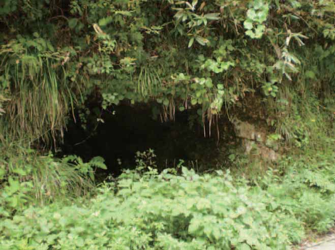 アクセス方法のところで示した車を止めるところから道路沿いに100mほど下ると、道路脇斜面に穴が空いています(写真3)。これはガラス原料として石英を採掘した跡といわれ、地元の人によって、1955年(昭和30年)前後に3年間ほど掘られたことがあるそうです。