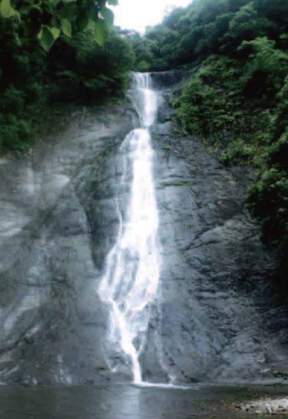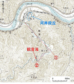 観音滝は、江の川の支流鹿賀谷川にあり、落差が約40m、平均斜度50度の比較的なだらかな滝です(写真1)。この滝の頂部付近には二段の棚があり、それぞれの棚には小規模な滝壺ができています。