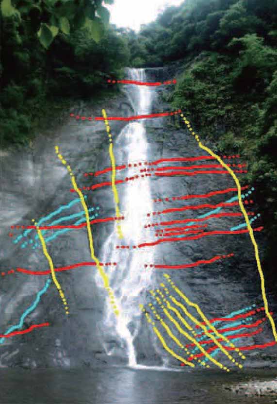 安山岩の岩片を特徴的に含む凝灰岩でできている滝と、その斜面に系統的に刻み込まれた割れ目を観察できます。