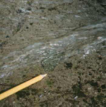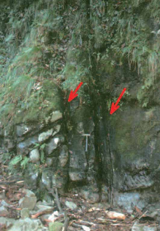 割れ目の中には、割れ目に沿ったずれの見られるものがあります(写真3、写真4)。このような割れ目は断層と呼ばれ、観音滝では北東―南西系の小断層が多く見られます。さらに滝から下流約500mまでの間には、この系統の断層がきわめて狭い間隔で無数に発達しているので、小規模な断層帯があると考えられます。