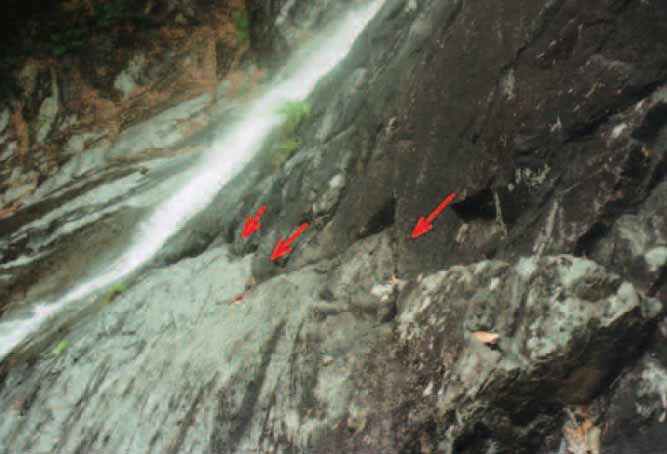 岩石中にほぼ等間隔で発達するズレを持たない小さな割れ目を節理と呼びます。この滝の斜面に見られる節理は、方向別に3系統に分けられます(写真2)。そのうち、北東―南西系の節理と北西―南東系の節理は、鹿賀谷川の全流域とその周辺に広く見られ、谷川はこの2系統の節理に沿ってほぼ直角に細かく屈曲しています。
