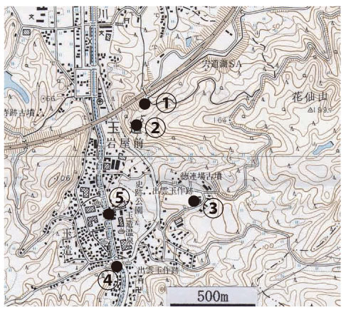 花仙山の麓では,それらのめのうから勾玉や管玉を作った工房跡の玉作り遺跡が30ヶ所以上みつかっています.出雲玉作資料館下の史跡公園は,古墳時代の玉作り遺跡がみつかった場所のひとつで,そこには玉作りの工房が復元されております.また,出雲玉作資料館では多くの遺跡から出土しためのう製品(国指定重要文化財)やそれらを制作した道具類などもみることができます. さらに足を延ばすと,出雲国風土記に「川辺に湯が湧き」とある玉造温泉始まりの跡(川辺の出湯跡)や玉湯川岸の足湯場があります.なお,「いずもまがたまの里伝承館」では勾玉作りの体験ができます. 一般にめのう(瑪瑙)とよばれているものには,鉱物学的には玉随(ぎょくずい)の一種で,主に細かい繊維状石英の集合体です.めのうには,白,赤,青,緑などさまざまな色をしたものがあります.なお,碧玉(へきぎょく:ジャスパー)とよばれる宝石も,鉱物学的にはめのうと同じ玉随です. アクセス山陰道松江玉作ICの南西方約4.5kmの出雲玉作資料館で“めのう公園”駐車場への道を聞くと良いでしょう.駐車場から採掘穴跡までは遊歩道が整備されています. 関連する情報出雲玉作資料館: いずもまがたまの里伝承館: 天然記念物などの指定情報