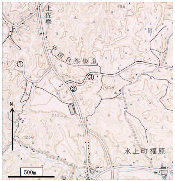 地点3の露頭(写真1)は、農道のカーブ南東側の切り割りです。この法面には、下から礫層(厚さ2m以上、写真2)、砂層(厚さ1m)、火山灰層(厚さ0.1m、)、粘土層(厚さ4m、写真3)及び礫層(厚さ4.2m以上)がほぼ水平に重なっております。粘土層の基底面の標高は205m付近にありますから、この粘土層は下部粘土層になります。また、この粘土層中には厚さ30cm以下の赤紫色の地層が切れ切れに挟まれています(写真3)。この地層は植物遺体が水底に堆積してつくられた泥炭層です。 アクセスバス:JR大田市駅前より「世界遺産センター」方面行きバスで約30分で「世界遺産センター」まで行く。そこから徒歩約20分。 自家用車:大田市街内で国道9号より国道375号に入り、約2.5km先で右折して県道46号を約10km行くと「石州瓦創造広場」。 関連する情報文献:服部 仁・鹿野和彦・鈴木隆介・横山勝三・松浦浩久・佐藤博之(1983)三瓶山地域の地質。地域研究報告(5万分の1図幅)、地質調査所、168p。 天然記念物などの指定情報なし 地質学的な意義中部粘土層と上部粘土層の間に大江高山火山群の初期噴出物の大家火山灰流堆積物が挟まれており、水上層堆積期に大江高山火山群が活動していることが判ります。また、すぐ近くにある世界遺産の大森銀山の銀鉱脈は大江高山火山群の活動に伴って形成されているので、瓦粘土と銀鉱床は同じ時代の産物といえます。さらに、水上層が堆積した湖は当時の江川を大江高山火山群がせき止めたためにつくられたと考えられています。なお、見学した露頭の一番上に重なる礫層中には、大江高山火山を構成するデイサイトが礫として入っておりませんので、この礫層が堆積したときにはまだ大江高山火山は活動していなかったと考えられます。大江高山火山の噴出物が水上層に重なっているのが観察できるのは、福原南側の標高240mより高い山地です。 |
