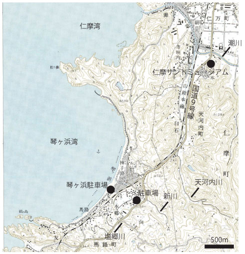 [みどころ | 交通 | 関連情報 | 指定 | 地質学的な意義] みどころ仁摩町馬路の琴ヶ浜海岸は、歩くとキュッキュッと琴の音のように鳴り、また美しい微小な貝を含んだ「鳴り砂」の浜として知られています。最近では、このキュッキュッという音の他、拳で砂の表面をたたくと「ドーン、ドーン」と太鼓の音のように聞こえる場所もあることがわかってきました。 写真1:空中写真による琴ヶ浜海岸(シルバーランド振興財団提供) アクセスJR山陰線 馬路駅下車 徒歩3分 自家用車の場合は、仁摩サンドミュージアム方面より国道9号線を南方へ約2km、駐車場右折(案内板あり)。浜近くに駐車場あり。 関連する情報仁摩サンドミュージアム:http://www.sandmuseum.jp/ 文献 1:(財)シルバーランド振興事業団(2001) 琴ヶ浜海岸環境整備事業の施工に伴う海岸環境の事業効果調査報告書 文献 2:鳴り砂往来 志波靖麿(2005) 鳴り砂の不思議現象。粉体と工業、37巻5号。 天然記念物などの指定情報「日本の渚・百選」選出 1996年 「日本の音風景・百選」選出 1996年 地質学的な意義仁摩サンドミュージアムを見学すれば鳴り砂の特徴として下記のことがよくわかります。 (1) 音発生のメカニズム砂が鳴る原理は、砂粒子間に発生するステイック・スリップ(固着すべり)という現象によるものと考えられています。もし、砂の表面が、物理的、化学的に汚染されてしまうと、摩擦係数が急激に低下しその現象が生じなくなるとされています。 (2) 鳴る砂と普通の砂鳴る砂と鳴らない砂の表面は、写真1と写真2ののような違いがあります。普通の砂の表面は、微粒子(粘土)が付着していて凹凸があることがわかります。一方鳴り砂の表面は、研磨され非常になめらかで粘土などの不純物の付着がありません。 また、砂の音波形を比較すると図1-1、図1-2のように鳴り砂は規則正しい波形を示しますが、普通の砂は不規則で、音の発生も雑音的です(文献1)。 (3)琴ヶ浜の砂は、どこからきたのか?琴ヶ浜には小さな2本の川(新川(しんかわ)、塩郷(しおごう)川(がわ))が背後の山地から注ぎ込み、東側の脊梁部を越えると天(あま)河(ご)内川(うちかわ)が潮(うしお)川(がわ)に合流して、仁摩湾に注ぎ込んでいます。また琴ヶ浜海岸は、半円形を呈していて、沿岸流が流入しやすい状況にあります。近年、研究が進み砂の「粒度分布、粒子写真、及び化学組成」などの比較により、天河内山頂(第四紀完新世の風成砂層が分布)や天河内川、及びその土手から採取した砂が琴ヶ浜海岸の砂によく似ていることがわかってきました(文献1、文献2)。 このような結果から、琴ヶ浜の砂は、周辺の丘陵地や山地に起源を求められる可能性があることがわかってきました。琴ヶ浜を散策するのも健康的で良いと思いますが、周辺の丘陵地に出かけることも新しい発見があってよいのではないでしょうか。 . |