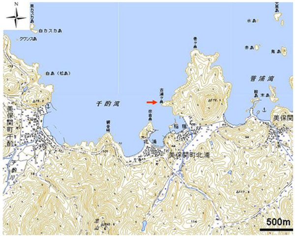 [みどころ | 交通 | 関連情報 | 指定 | 地質学的な意義] みどころ島根半島には新第三紀中新世に貫入したドレライト~はんれい岩が分布します。それが火成活動に伴う熱水作用によって再結晶作用を受け、構成鉱物が粗粒となっている部分があります。ドレライトを構成する主な鉱物はかんらん石、輝石、斜長石ですが、はんれい岩の部分には熱水作用で生成した珍しい鉱物が生じています。その中でも特徴的な鉱物は鉄に富むパンペリー石、ぶどう石、バビントン石で、数cmの空隙に産出します。これらの鉱物を最も良く観察できる場所のひとつが松江市美保関町の古浦ヶ鼻です。 本地域のパンペリー石は、日本で最も鉄に富むことが特徴(Ca8(Mg、Fe2+、Fe3+)4(Al、Fe3+)8Si12O56-n(OH)n)で、そのために暗濃緑色をしています。通常個々の結晶を肉眼で見ることはできませんが、針状結晶が集まってカリフラワー状の集合体を形成しています。鉄に富むパンペリー石とともに、無色から淡緑色のぶどう石が産出します。この鉱物は、実際は板状の結晶ですが、細かい板状結晶が集合して粒状の集合体を形成します。ぶどう石(Ca2Al(Si3Al)O10(OH)2)は通常無色透明ですが、淡緑色をしているぶどう石は三価の鉄を含んでいます(Ca2(Al、Fe3+)(Si3Al)O10(OH)2)。バビントン石(Ca2(Fe3+、Mn)Fe3+Si5O14(OH))は黒色で、一辺が数mmの菱面体の結晶として産出します。非常に美しい結晶で、バビントン石としては日本の一、二を争う良い結晶といわれています。ぶどう石、灰(かい)鉄(てつ)輝石(きせき)、緑(りょく)簾(れん)石(せき)、石英、方解石などと共に産出します。