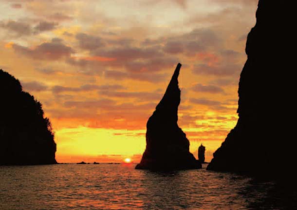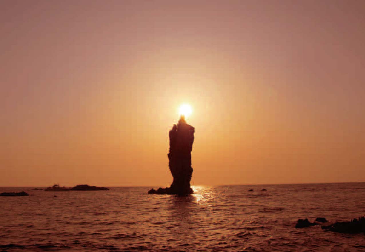 島後西部の久見地区の西約2kMの海上には多くの小島が存在しています。中でも、ローソクの形をしたローソク島が夕日に映える様子は圧巻で(写真1)、