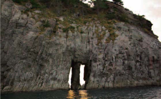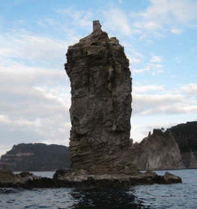 天空にそそり立つ鉄砲岩、こんもりした馬背島などが独特の景観をかもし出しています。 この海岸や小島を形成している地層は、約550万年ほど前に噴出した重栖層と呼ばれる火山岩類です。