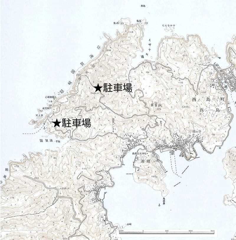 [みどころ | 交通 | 関連情報 | 指定 | 地質学的な意義] みどころ写真1:国賀南の町道から国賀海岸を望む(写真提供:西ノ島町) 隠岐島前は西ノ島、中ノ島および知夫里(ちぶり)島の3つの有人島と多くの小島からなります。これらの島々は焼火山(たくひやま)を中央火口丘として、それを取り囲む山々と知夫里島、中ノ島を外輪山とするひとつの大きなカルデラ火山と考えられており、島前火山と呼ばれています。ただし,島前火山が活動したのは約630~530万年前で、現在ではその大部分は海面下にあります。 西ノ島町北西部の国賀海岸は、約10kmにわたって海食崖や海食洞が連続し、奇岩も数多く見られる景勝地です(写真1)。焼火山を除く西ノ島の山々は島前火山の外輪山を構成しています。国賀を含む外輪山はアルカリ成分を多く含んだ塩基性~中性の火山岩である粗面玄武岩~粗面安山岩の火砕岩や溶岩からなっています。 アクセス自家用車あるいはレンタカーを利用する場合は、別府港から浦郷経由で約15分。駐車場あり。 町営バスは別府、船越、浦郷から乗車、国賀下車(3月1日~12月15日)。 別府港と浦郷港から定期観光船・定期観光バスが運行(3月21日~11月20日)。 観光タクシーも利用可。 関連する情報千葉とき子・金子信行・鹿野和彦(2000),浦郷地域の地質(5万分の1地質図幅「浦郷」).地質調査所 西ノ島町役場: http://www.town.nishinoshima.shimane.jp/ 天然記念物などの指定情報大山隠岐国立公園特別保護区、1935,国指定,名勝および天然記念物 「日本列島ジオサイト地質百選」に「隠岐島前カルデラ」として選定されている。 地質学的な意義写真2:摩天崖を望む (写真提供:西ノ島町) 国賀海岸の摩天崖は粗面玄武岩~玄武岩質粗面安山岩の溶岩が何層も積み重なったもので、浸食や岩盤の崩落・崩壊が進み、高さ約260mの断崖となっています。溶岩(アア溶岩)には著しく発泡したクリンカーと呼ばれる砕片状のものが上面に伴われますが、そのガサガサした部分は風化・浸食を受けやすいため凹状になり、それ以外の固い部分が突出して、薄い溶岩の積み重なりが確認できます(写真2)。また摩天崖の南西の海岸部には多くの波食洞が連続して形成されています(写真3)。通天橋はこの波食洞の奥の部分が崩落し、周辺が浸食されることにによってできた特異な地形です。ここでは何層も積み重なった粗面玄武岩~玄武岩質粗面安山岩の溶岩が、一部赤色酸化を受け、そこに白っぽい粗面安山岩が地層に平行に貫入していて、独特の景観をつくっています(写真4)。また、周囲には浸食によってできた奇岩が数多くあります。付近の海岸や町道には、白っぽい色をした幅1~2mの粗面岩~流紋岩の岩脈が何本も見られますが、これは中央火口丘から放射状に伸びたもので、噴火の中心が焼火山にあったことをうかがわせるものです。また通天橋の板状の貫入岩もこの岩脈と同じようにしてできたものです。 写真3:摩天崖の南西から通天橋にかけて見られる波食洞群 写真4:通天橋を望む |