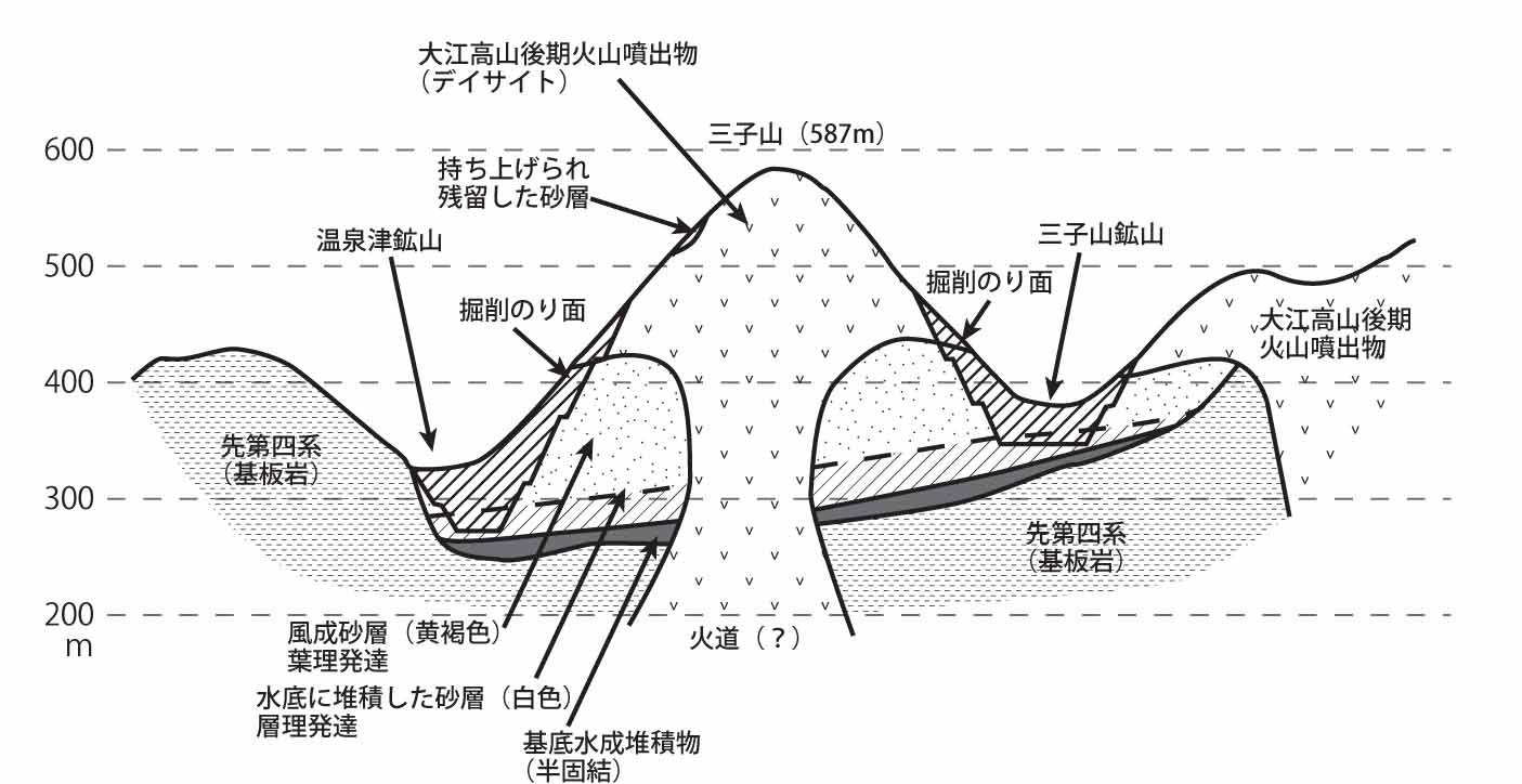 アクセス島根県大田市温泉津町井田地内に位置し、車では、温泉津町方面からは、県道温泉津川本線(4)より鉱山専用道路(6)、町道(7)、(8)、(9)を通過して見学可能。(鉱山区域内には立ち入り禁止) 関連する情報特になし。 天然記念物などの指定情報特になし。 地質学的な意義 この砂層は、180万年前頃の第四紀初頭、現在の日本海に面した海岸部より伸びる細長い入り江が三子山の南方まで入り込んでいました。強い西風によってこの湾の波打ち際から砂が陸側に運ばれ堆積して、砂丘がつくられたと考えられます。層厚は50~60mにも及び、赤褐色を呈する水平な粘性土層(層厚数cm~数十cm)が数枚はさまれていることから、休止期を伴いながらも相当長期間供給されていたものと推測されます。その後、大江高山火山群の一つ三子山火山の貫入、噴出によって現在の地形・地質が形成されました。(図1参照) |