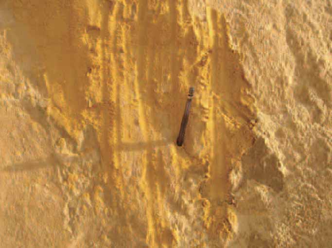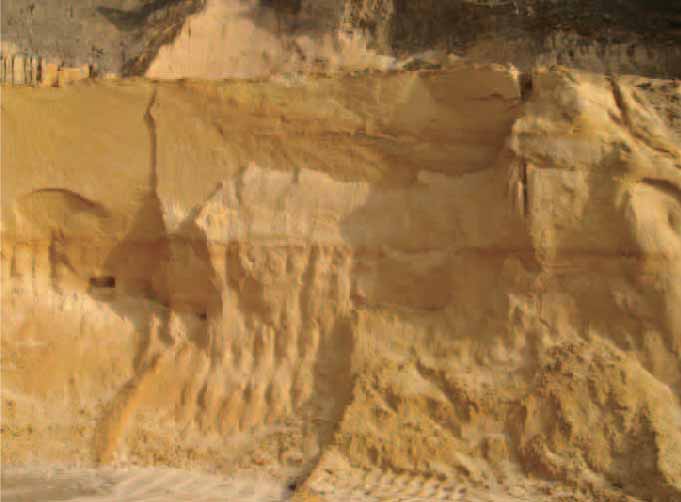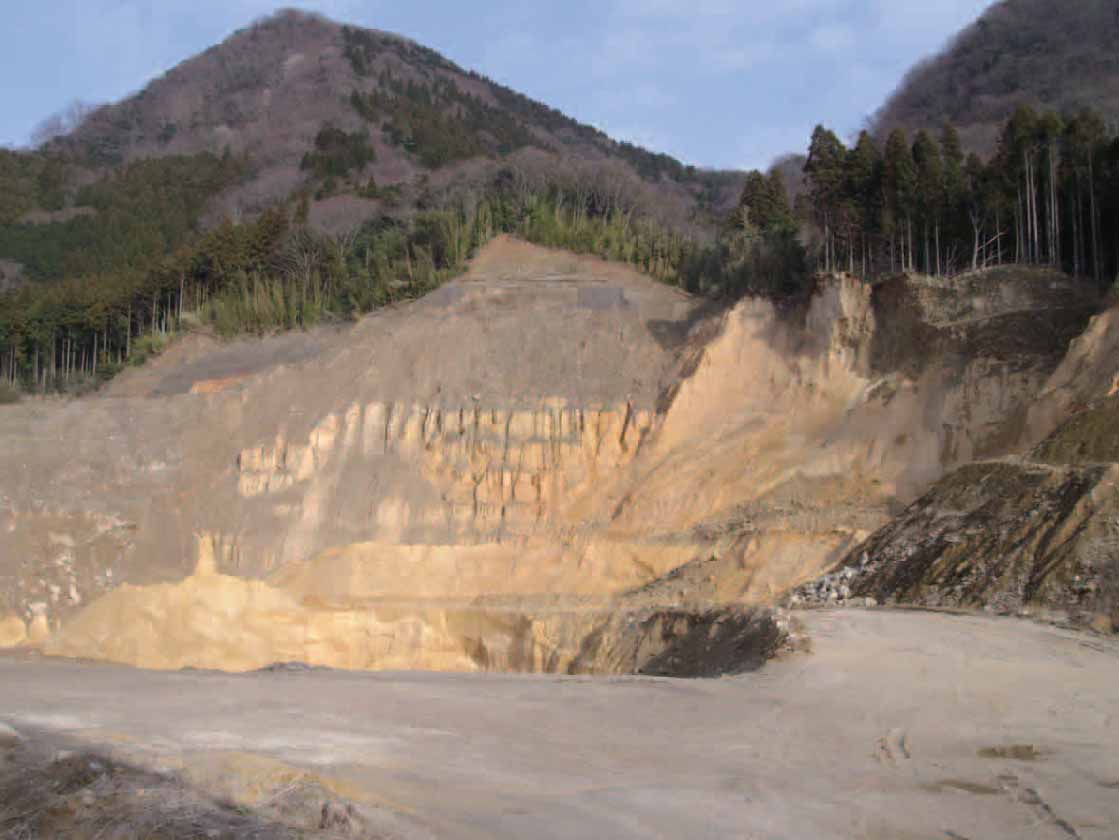 写真1:三子山西方山麓に分布する風成砂層(珪砂層)の採掘場 大田市の南西部、温泉津町井田地区に位置する三子山周辺には、均質な砂層が分布しています。この砂層は、周辺に分布する大江高山前・後期火山岩類や水成堆積物等からなる約300万~150万年前(鮮新世後期~更新世初頭)に堆積した都野津層の上部に属します。特に、三子山の東西山麓に分布する砂層は、珪砂鉱床(ガラスや鋳物原料)として採掘されています。西側では東西約500m、南北約800mの広がりを有し、層厚は約50m。東側では東西約300m、南北約300mの広がりを有し、層厚は約60mと推定されています。西側では採掘が進み、第1採掘場は埋立て造成され、現在第2採掘場が稼行されています。日本でも有数な埋蔵量を誇る珪砂鉱床が見どころです。