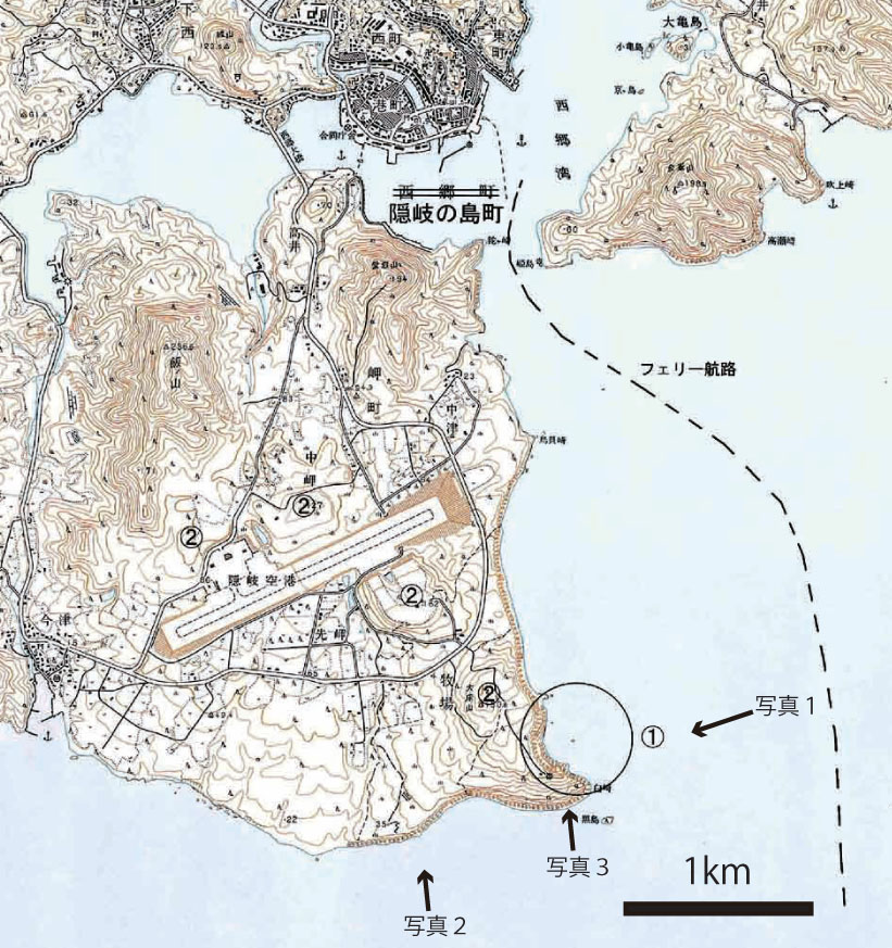 [みどころ | 交通 | 関連情報 | 指定 | 地質学的な意義] みどころ写真1:岬の爆裂火口をフェリー航路から望む 西郷港南西の隠岐空港がある地区は岬町と呼ばれ、中期更新世前期(いまから約55万年ほど前)に活動した岬玄武岩が東西3km×南北3kmにわたって標高100m以下の溶岩台地を形成しています。空港の造成工事前には、直径200~300m、標高150~160mのスコリア丘(1)が北西-南東方向に配列し、特異な火山地形を形成していましたが、工事で消滅し、残るのはここに紹介する爆裂火口(2)のみとなりました(上記地図参照)。 この爆裂火口は、火口の東半分が吹き飛んだもので、岬玄武岩を構成する5つの地層のうち下部火砕岩層、中部溶岩層、上部火砕岩層の3つを見ることができます。下部火砕岩層には特徴的に海蝕洞が形成され、黄褐色を呈していますが、上部は高温酸化を受けて赤色化しています。火口底から伸びる赤色の高温酸化帯は南・北で急傾斜し、火口壁の形を見事に現しています。この上位には暗灰色の中部溶岩層と黄褐色の上部火砕岩層が火口の西側壁を形成しており、緩く西に傾斜しているのをフェリーから見ることができます(写真1)。 写真2:岬の溶岩台地を南から望む アクセス自家用車あるいはレンタカーを利用する場合は、西郷港から隠岐空港経由で約10分。 関連する情報村上久(2008)爆裂火口の断面を見る-西郷港入り口-. 天然記念物などの指定情報大山隠岐国立公園特別地域 地質学的な意義岬玄武岩は隠岐で最も新しい火山岩の1つです。下部火砕岩層はマグマー水蒸気噴火(爆発)あるいは水蒸気爆発によって堆積したもので、細~小礫を含む斜交~平行層理が発達しており、その中には火山弾も多く見られます(写真3)。また中部溶岩層は、塊状部とクリンカーと呼ばれるガサガサした多孔質のコークス状岩片をともなうかんらん石玄武岩の溶岩で、何枚も積み重なっています。これは溶岩の温度が低かったり、溶岩の粘性が高い場合には、溶岩の表面がクリンカーで覆われやすくなるためで、この特徴を持つ溶岩はアア溶岩と呼ばれます。.上部火砕岩層は下部火砕岩層同様の成因による堆積物で、下部火砕岩層と同じような特色を持っています。 古い地形図を基に地形傾斜から溶岩流の給源を推定すると、1つは旧空港の北側付近、もう1つが爆裂火口、さらに大床山とその北側にも存在し、スコリア丘の位置とほぼ一致しています。 写真3:下部火砕岩の斜交層理と火山弾 |