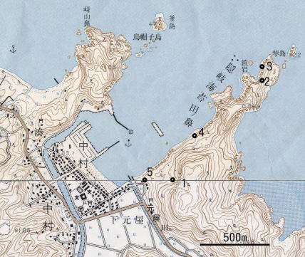 写真1 海苔田ノ鼻 隠岐諸島島後の北端に近い隠岐の島町下元屋地区の北東の海岸から北東に突き出した半島は「海苔(のり)田(だ)ノ鼻(はな)」とよばれています. 海苔田ノ鼻を遠望すると,一番最初に目に入るのは半島根元の暗灰色で見事な柱状の割れ目が発達した岩壁でしょう.この岩壁は三水(さみず)崖(だき)とよばれ, 玄武岩の溶岩でできております.岩壁の割れ目は溶岩が冷え固まるときにできたもので,六角柱状に割れており,これを柱状節理といいます. 元屋(がんや)川河口から,遊歩道が整備されており,これをたどっていけば半島の先まで行けます. 遊歩道を入ってしばらく進むと,先ほどの岩壁の麓にさしかかった途端,突然,目の前に岩塊がごろごろと積み重なった驚くべき風景が我々を迎えてくれます. 玄武岩の岩塊は風化がすすみ割れやすくなっており,柱状節理に沿って崩れ落ちてきたものです.ここで玄武岩を間近に観察することができます. また,雨のあとなど岩壁の上から滝がみられることがあり,三水の滝と呼ばれています.