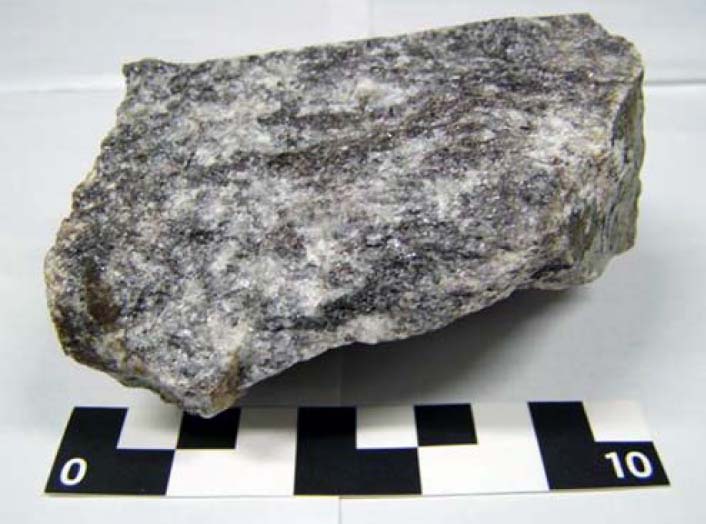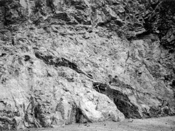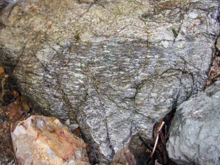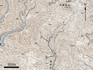 [みどころ | 交通 | 関連情報 | 指定 | 地質学的な意義] みどころ隠岐島後島北東部の葛尾山付近を中心とする半径およそ8 kmのほぼ円形の地域には、隠岐片麻岩類(または隠岐変成岩類)とよばれる変成岩が分布しています。隠岐片麻岩類の分布地域には、泥質片麻岩、ミグマタイト質片麻岩、片麻状花崗岩、角閃岩のほか少量の石灰質片麻岩と珪質片麻岩をみることができます。泥質片麻岩はもともとは海底にたまった泥質(一部は砂質)の堆積物ですが、これが固まって泥岩となった後、地下に押し込められて高温の状態となり(隠岐変成岩類ではおよそ摂氏800度),粗粒の結晶からなる変成岩となったものです。この泥質片麻岩は石英や長石類からなる白っぽい部分と黒雲母が多い黒っぽい部分が縞状になっているのが特徴です(写真1)。泥岩が地下深くに押し込められてしだいに高温になり、摂氏650度から700度になると、その一部が融け始めます。このようにして、岩石が融けたものをマグマといいます。このマグマが地表に向かってあまり上昇せず、近くで固まると花崗岩になります。泥質片麻岩とその一部が融けてできた花崗岩質岩が混ざりあってできた岩石をミグマタイトまたはミグマタイト質片麻岩といいます。 西郷北方,有木川の上流部には泥質片麻岩やミグマタイト質片麻岩が広く分布します。地形図の(1)付近の林道の切り割り(写真2)にはミグマタイト質片麻岩(写真3)と泥質片麻岩を見ることができます。これらの片麻岩中には最大で直径5 mmぐらいの赤い粒状のざくろ石(ガーネット)の結晶が含まれていることがあります。林道沿いの崖は風化が進んでいますので、内部の新鮮な部分の観察をするには表面をハンマーで割って見る必要があります。この付近の有木川の河床では、水流によって磨かれた各種片麻岩を観察することができますが、河床に降りるときや河床では足を滑らさないよう細心の注意が必要です。(1)の地点のおよそ500 m下流には砂防ダムがあります(地点(2))。この砂防ダムの基底付近には、かつて(ダムの建造される前)、ミグマタイト質片麻岩の中に角閃岩がレンズ状に挟まれている様子が見られました(写真4)。現在はこの露頭の一部しかみることができませんが、林道からダムに沿って河床に降りると、黒っぽい柱状の角閃石が集まってできた角閃岩がミグマタイト質片麻岩中にあるのが見られます。ただし、林道から急斜面を20 mほど降りる必要がありますので、装備のない場合は露頭にまで行くことはできません。