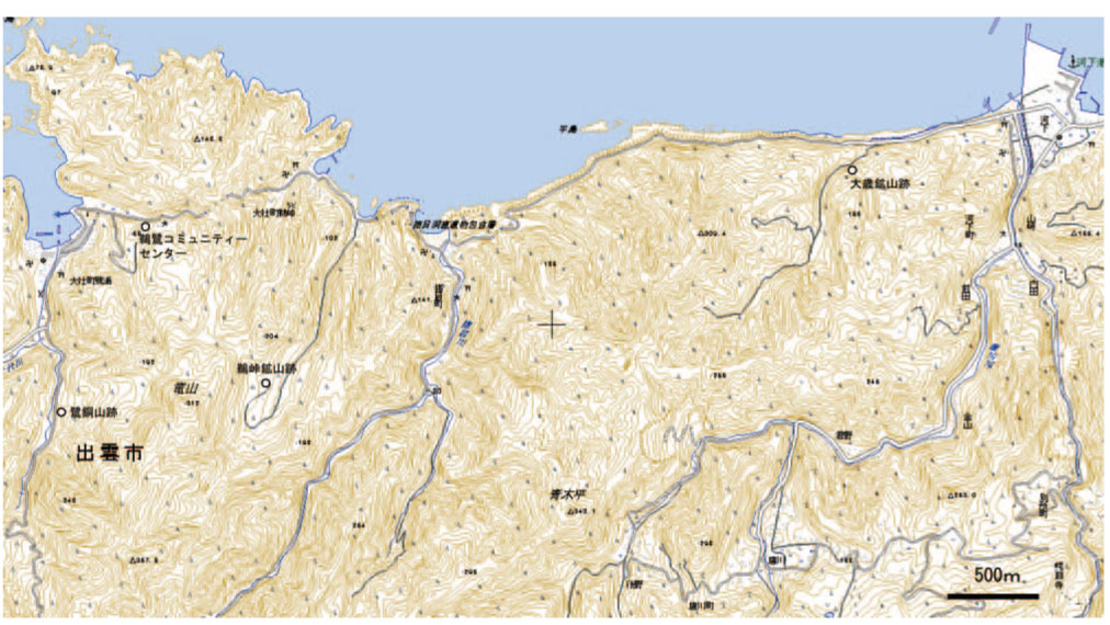 [みどころ | 交通 | 関連情報 | 指定 | 地質学的な意義] みどころ出雲市大社町鷺浦~十六島(うっぷるい)湾にかけていくつかの鉱山跡があります。これらは海底火山活動にともなう熱水の噴出によって形成された黒鉱(くろこう)と呼ばれるタイプの鉱床で、かつて石膏や銅・銀・鉛・亜鉛を産出した鉱山の跡がわずかに残されています。 鷺銅山跡は道路沿いのうっそうとした杉林のなかに、竪坑(たてこう)の坑口など、往時の痕跡がごくわずかに残されているのみです(写真1)。鵜峠鉱山跡は管理上の問題があり現在立ち入ることはできませんが、 鵜鷺コミュニティーセンターには鵜峠鉱山で実際に使われていた鉱山用具や坑道図面、鉱物標本などが保存・展示されています(写真2)。大歳鉱山には豊富な「ずり」(鉱石を採掘したあとのいらない岩石)とコンクリート製の貯鉱場跡などが残されています(写真3、4)。 アクセス鷺銅山跡:出雲市大社町鷺浦漁港から南(出雲大社方面)へ約1km 大歳鉱山跡:出雲市河下町十六島湾河下港から海岸沿いに約1km西方。 鵜鷺コミュニティーセンター:出雲市大社町鷺浦の鷺浦(さぎうら)漁港から東へ約1km。鵜鷺中学校跡。 関連する情報鹿野和彦・竹内圭史・大嶋和雄・豊 遙秋(1989)大社地域の地質.地域地質研究報告(5万分の1地質図幅).地質調査所.58p. 島根県地質図説明書編集委員会(1985)島根県の地質.島根県.646p 天然記念物などの指定情報なし 地質学的な意義この地域には鰐淵、鵜峠、唐川(からかわ)などの鉱山群があり、昭和30年代半ばにはわが国最大の産出量を誇る石膏鉱床群とされていました。古くは石見銀山同様、灰吹き法による銀精錬が行われた歴史ある鉱山もあります(鷺銅山)。鉱石は島根半島に広く分布する中期中新世(今からおよそ1500万年前)の成相寺(じょうそうじ)層や牛(うし)切(きり)層とよばれる地層に含まれています。鷺銅山は室町時代にはすでに開発され、明治5年(1872年)(精錬高116t(銀))および明治33年(1900年)(精錬高69t)に採掘のピークがあったとされます。鵜峠鉱山は1868年(明治元年)から銅を採掘しましたが1932年(昭和7年)頃には石膏を採掘し、1970年(昭和45年)に閉山しました。 大歳鉱山からは十六島湾を挟んで対岸の風力発電の風車を望むことができます(写真3)。この鉱山は1960年(昭和35年)に発見されて以降、閃亜鉛鉱、方鉛鉱、黄銅鉱などを採掘しました。尾根を隔てて南側には石膏で有名な鰐淵鉱山があり、大歳鉱山はその支山という位置づけでした。この地域では唯一、「ずり」が豊富に残されている鉱山跡ですが、山の斜面にあり危険ですので、立ち入る場合は細心の注意が必要です。まれに閃亜鉛鉱や方鉛鉱などの重量感のある鉱石を採取することができますが、細粒・塊状のため肉眼で結晶の形を確認することはできません。また紫外線ランプで黄色や赤色に光る(蛍光)方解石も採取することができます。雑木林のなかには当時の貯鉱施設の跡が残されていて、稼働当時の面影をしのぶことができます(写真4)。 |