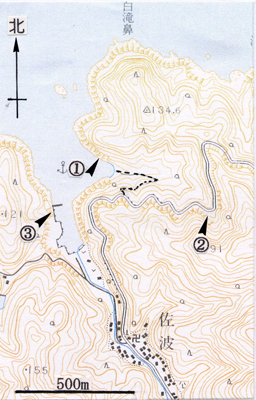 淡緑色火砕岩中に径30cm以下の黒灰色ないし灰色の大礫ないし巨礫がいくつも入っております。これらの礫の上位の葉理は礫を覆っていますが、下位の葉理は写真2のように下方に曲がっていたり、曲がりながら切られています。火砕物を噴出する激しい噴火が起きると、しばしば火口周辺の岩盤が礫状に壊されて、一緒に吹き飛ばされます。吹き飛ばされた礫が堆積しつつある火砕物の上に落ちるて突き刺ささります。同時に、この礫は火砕物にも覆われてこのような構造ができたのです。この火砕岩中に含まれている径10cm以上の礫の多くは飛んできたものでしょう。 この火砕岩中には青黒色ないし茶黒色の巨礫が密集した柱状の構造(写真1)があります。この巨礫の柱は直径約6mの円筒状をしており、緑色火砕岩の葉理を切ってほぼ垂直に立っております。また、巨礫は皆同じ玄武岩です。これは地下から上がってきたマグマが途中で礫化したもので、ここは地下深くからマグマが上がってきた通り道(火道)の一つだったのです。 県道に戻りましたら、地図の地点2の採石場跡にいきますと、長さ数cmの水晶の結晶が採集できます。安山岩溶岩中に直径数~20cm以上の穴がいくつのあります。この穴の壁や底をさがすと、長さ1~4cmの水晶の結晶がみつかります。この穴はマグマが冷えて固まるときに、マグマ中の揮発成分がマグマから分離してできた泡の跡です。また、佐波港の地点3では溶岩が海水に冷やされながら流れたときに作られた枕状溶岩のいろいろな様子をみることができます。 アクセス松江駅から車で約30分で佐波港に着きます。 関連する情報このweb siteの「桂島」、「加賀の潜戸」、「笠浦海岸」でも海底火山噴出物が見られます。 天然記念物などの指定情報大山隠岐国立公園 地質学的な意義笠浦と加賀より北側の海岸はほとんど崖のため、海岸にいくのだけでも、絶えず苦労と危険がついてきます。しかし、海岸の露頭状況は最高に良いので、これまでも海底火山に関する多くの研究が行われてきましたし、これからも行われるでしょう。とくに、高温のマグマと海水の接触によって起きた、いろいろな形態の水蒸気爆発の痕跡、海底火山の成長の様子、溶岩ドームの内部、大規模な火道などを直接見学できます。 |