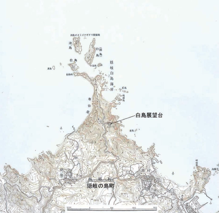 写真1:白島展望台より望む(写真提供:隠岐の島町) 白島海岸は島後の北端に位置しており、海岸を構成する岩石が白いことが名前の由来です。ここでは大小の島々が散在し、多くの波食洞が見られることから名勝地として有名です。駐車場から徒歩3分ほどにある展望台から眺めると、北の島々と岬は白い岩石、岬の東側は黒っぽい岩石で構成されていて、地質の違いが鮮明にわかります。また黒っぽい岩石は小さな島が多く、海がおどろくほど青く澄んでいることがわかります(写真1)。 アクセス自家用車あるいはレンタカーを利用する場合は、西郷港から原田・中村を経由して白島入り口まで約40分。原田・五箇経由あるいは大久・布施経由で約50分。白島入り口から約1kmに駐車場あり。中村から遊覧船で周遊可。 関連する情報産業技術総合研究所,西郷図幅説明書(2009年出版) 隠岐の島町: http://www.town.okinoshima.shimane.jp/ 天然記念物などの指定情報大山隠岐国立公園特別保護区、1938年,国指定,名勝天然記念物.オオミズナギドリ繁殖地 地質学的な意義白い岩石は、いまから550万年ほど前に噴出した流紋岩や粗面岩(アルカリ成分を多く含む中性の火山岩)で重栖層と呼ばれ、岬の先端から松島・黒島は流紋岩、その沖合の沖ノ島・白島(田島)・小白島は粗面岩でできています。白島ではドーム状の溶岩が観察され、沖ノ島では先に噴出した粗面岩を切って次の粗面岩が噴出した火道の様子や溶岩が垂直から水平へ形を変えて流れ出る様子が観察できます(写真2)。