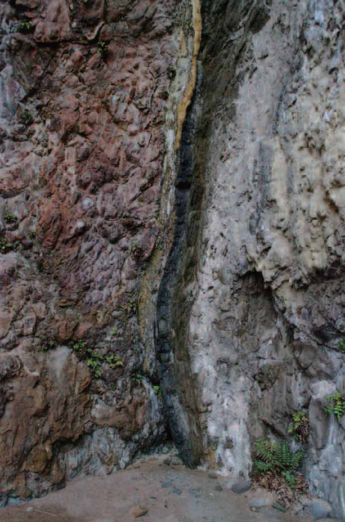 マグマの通路(フィーダー)を充填するのは約550万年前に貫入した粗面岩です。岩脈の左側(北側)は流紋岩溶岩、右側(南側)では凝灰角礫岩と接触しています。