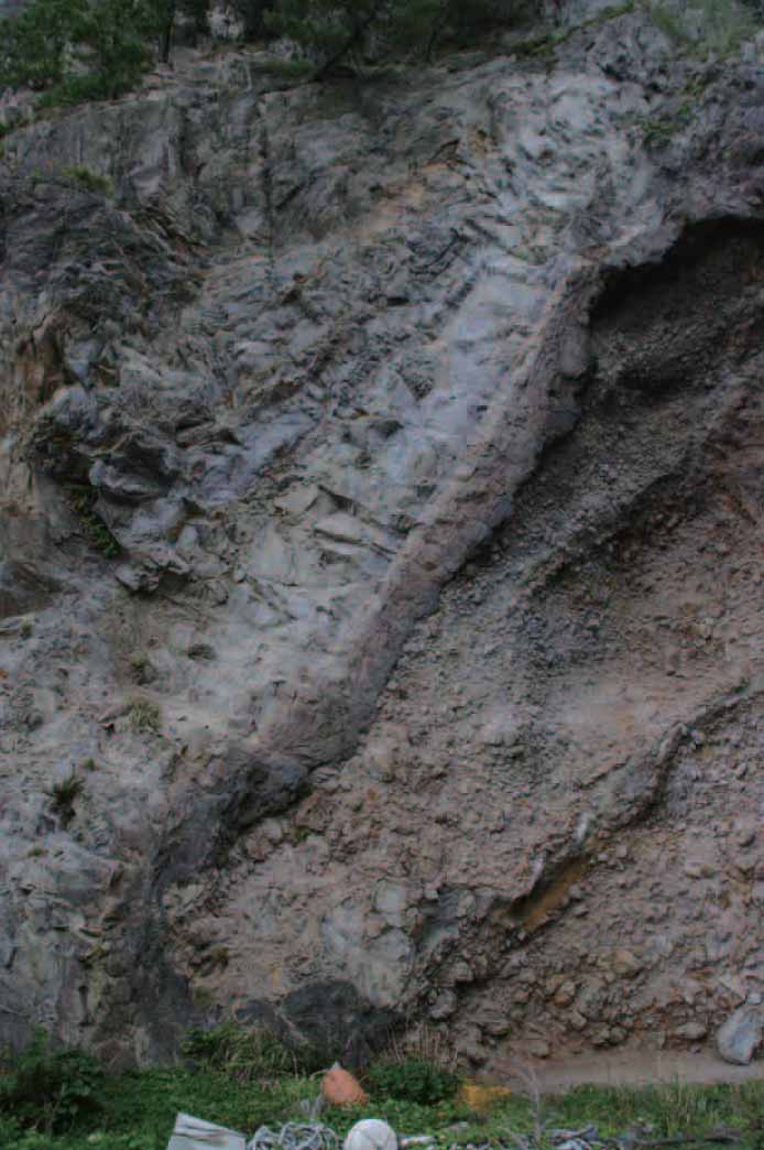 写真3:フィーダー岩脈南側の凝灰岩角礫岩との接触部 |