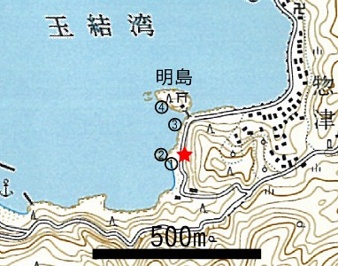 [みどころ | 交通 | 関連情報 | 指定 | 地質学的な意義] みどころ惣津は松江市北東部の島根半島の日本海沿岸に位置し、隠岐航路で知られる七類(しちるい)港の西約1kmの玉結(たまゆ)湾に面しています。玉結湾東側の海岸には、新第三紀中新世の古浦(こうら)層の砂岩泥岩互層、成相寺(じょうそうじ)層の黒色泥岩とドレライトの貫入岩が分布し、黒色泥岩は波食棚を作っています。ここでは古浦層と成相寺層の間の不整合面、成相寺層中の背斜褶曲、玄武岩質枕状(まくらじょう)溶岩、ドレライトの貫入に伴うペペライトが観察できます。