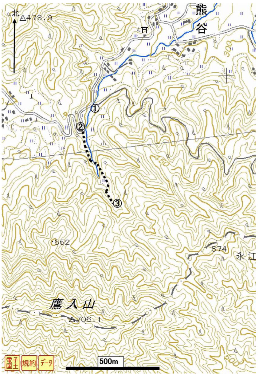 鷹入の滝の手前には落差5m前後の滝が3つあります。鷹入の滝を本滝とし、上の2つはほぼ連続するので2つ併せて第二の滝(写真2)そして一番下の滝を第三の滝(写真3)と呼んでおります。第二と第三の滝の間から見上げますと、鷹入の滝までが見通せて、やはり険しい谷底と感じます。 アクセス安来で国道9号線から県道9号(安来伯太日南線)に入り伯太川に沿って南下すると、県道105号の入り口に「鷹入の滝・上の台緑村」の標識があります。標識に従って県道105号を進むと、地図上の地点(1)に来ます。ここには案内板がありますが、同じような案内板が奥にもありますので、右折して250m程進むと駐車場(地点(2))があります。ここから鷹入の滝まで遊歩道が整備されていて、小学生でも歩けるようになっております。 関連する情報島根県ホームページ中の「島根の名水百選」:https://www.pref.shimane.lg.jp/infra/kankyo/kankyo/mizu/meisui/ 天然記念物などの指定情報島根県の名水百選のうち“ふるさとの滝”に選定される(1985年) 環境省の“平成の名水”に選定される(2008年) 地質学的な意義鷹入の滝を作っている岩石は古第三紀に形成された根雨花崗岩です。伯太川と飯梨川の上流域には古第三紀の花崗岩類が広く分布しております。これらの花崗岩の多くは著しくマサ化していたので、江戸時代から明治時代にかけては、人力で花崗岩を崩して流水中に入れ、比重の違いを利用して花崗岩に含まれている磁鉄鉱を採集しました。このような砂鉄の採集方法をかんな流しといいます。小竹川流域でもかんな流しが盛んに行われていましたので、現在集落ができている周辺にはその痕跡を示す緩やかな地形が広がっております。 |