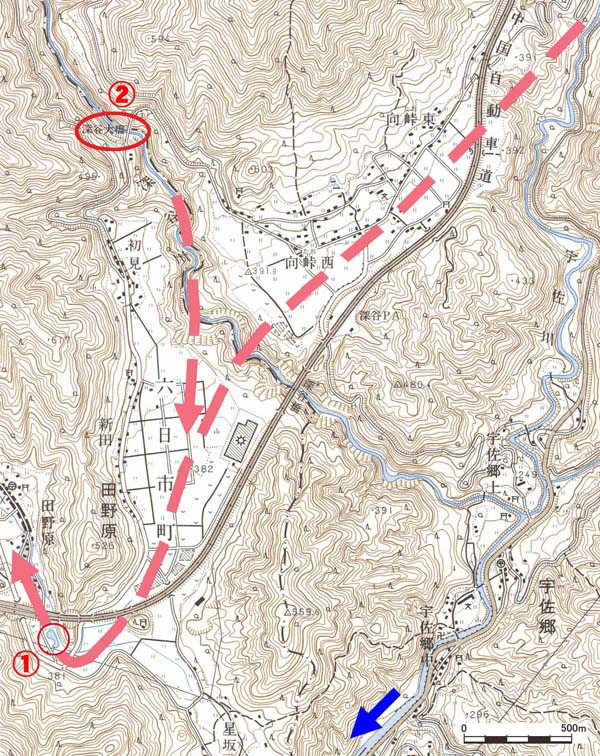 [みどころ | 交通 | 関連情報 | 指定 | 地質学的な意義] みどころダムのない清流として知られている高津川は吉賀町田野原にその源を発し、津和野町、益田市を抜けて日本海に注ぐ長さ81km、流域面積1090km2の一級河川です。かっての高津川は今よりも広大な流域をもっていましたが、その源流部は瀬戸内海に流れる錦川の支流である宇佐川や深谷川によって争奪されてしまいました。現在は無能河川※1となった幅広い旧河床が、山口県側から島根県側の田野原にかけて続いています(写真1)。山口県との県境となる深谷川はかつての高津川本流を横断して深く削り込んでいて、その名の通り80~100mの深さのある峡谷をつくっています(写真2)。