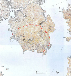 [みどころ | 交通 | 関連情報 | 指定 | 地質学的な意義] みどころ島前は焼火山(写真1)を中央火口丘として、それを取り囲む山々と知夫里島、中ノ島(海士町)を外輪山とする約630~530万年前のカルデラ火山と考えられています。この中央火口丘は、粗面岩(主にアルカリ成分を多く含む中性の火山岩)の火砕岩類からなる火砕丘で、その多くが溶結凝灰岩で出来ています。溶結凝灰岩とは一度火山の爆発で破砕されたマグマの岩片が、堆積後自分の持っている熱で再び溶けて固まったもので、黒っぽいガラスの中に、結晶片や岩片、溶けた軽石片を混じるのが特徴で(写真2)、林道沿いの地点1の露頭から焼火山駐車場(地点2)に至る林道で観察できます。また、駐車場から15分ほど山頂目がけて歩くと焼火神社(地点4)に至ります。この神社はオーバーハングした非溶結の火砕岩中の洞穴に造られており、独特の景観を持っています(写真3)。また、神社社務所の石垣(地点3)は溶結凝灰岩で出来ており詳細な観察が可能です。火砕丘の北側には島前火山の基盤をなす美田層と呼ばれる1900万年前の湖に堆積した地層(地点5)や、1200万年前に海に堆積し、貝化石を含む市部層と呼ばれる砂岩層(地点8)が観察できます。林道の大山側では、これらの地層を貫く、日本では珍しいアルカリ岩の深成岩である石英閃長岩(地点6)と、接触変成作用を受けてホルンフェルス化した美田層(地点7)を観察することができます。 アクセス自家用車あるいはレンタカーやタクシーを利用する場合は、別府港から波止経由で駐車場まで約20分。 関連する情報千葉とき子・金子信行・鹿野和彦(2000),浦郷地域の地質(5万分の1地質図幅「浦郷」).地質調査所 西ノ島町役場: http://www.town.nishinoshima.shimane.jp/ 天然記念物などの指定情報大山隠岐国立公園、1992 国指定重要文化財(建第二二七二号) 「日本列島ジオサイト地質百選」に「隠岐島前カルデラ」として選定されている。 地質学的な意義焼火山の北側では島前で最も古い地層や珍しい閃長岩(写真4)を観察することができ、島前地域の地史を理解することが出来ます。伏在する火口壁の内側は同心円状に地層が内側に20~90°傾斜し、外側では逆に外側に40~80°傾斜しており、火山体の構造が読み取れます。また、平行~斜交層理の発達したマグマ水蒸気爆発を起源とする火砕サージ堆積物など、火山噴出物の多様な現象を観察することができます。 |