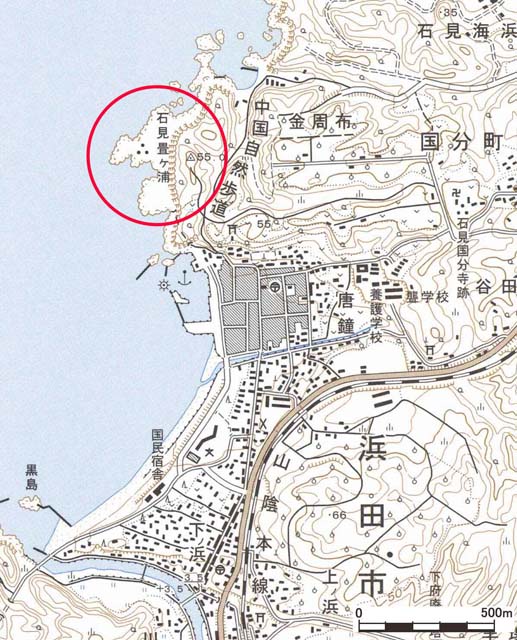 砂岩層からは南方系で浅海性を示す貝化石が約40種みつかっています.これは,当時は現在よりも高温の暖流(古対馬海流)が日本海沿岸に流れ込んでいたことを示すものです. 千畳敷は1872年(明治5年)に発生した浜田地震(マグニチュード7.1)によって海岸一帯が約1.5m隆起し,海底から出現したとされていますが,最近見つかった江戸時代の沿岸絵図(浦絵図,1845年頃の作成)には,千畳敷が一部を除いて現在とほぼ同じ景色で描かれています.これは,千畳敷が浜田地震によって海底から突然出現した,という説に疑問を投げかけるものです. |