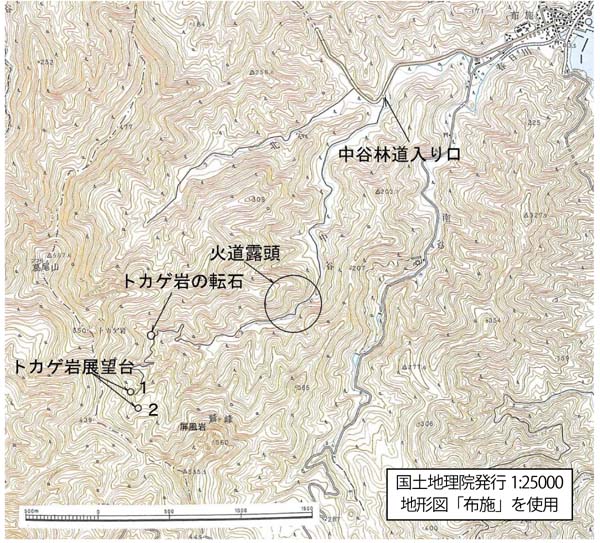 林道終点の駐車場から登山道に入り、展望台1,2からは右手にトカゲの形をした岩が(写真1)、さらに上に続く登山道からは鷲ヶ峰(わしがみね)に屏風の形をした岩(写真2)が見えます。トカゲ岩は粗面岩マグマが流紋岩質火山砕屑岩(火山噴火によって地表に放出された破片状の岩片と火山灰が固結してできた岩石。火砕流堆積物,降下火山砕屑物,火砕サージ堆積物などがある)に貫入したもので、岩脈と呼ばれるものです。この岩脈はまわりの岩石より硬く風化しにくいために飛び出しており、その姿がちょうどトカゲが岩をよじ登っている姿に似ていることから名付けられました。手の部分は浸食を免れて残った部分ですが、足の部分は上から落ちてきた岩が割れ目にはさまったものです。また,屏風岩は高温の流紋岩質火砕流堆積物が固まる時に,柱状の割れ目(柱状節理といいます)が発達し,この割れ目に沿って崩落したために急崖となり、それが屏風のように見えることから名付けられたものです。 アクセス自家用車またはレンタカーをご利用の場合は,西郷港から原田・中村経由で中谷林道の入り口まで約40分、または西郷港から大久・卯敷・布施経由で約35分。遊歩道有り。 関連する情報参考図書:沢田順弘・小林伸治・村上 久・當銘あかね(1998)日曜の地学25島根の自然をたずねて.14-18頁.島根の自然編集委員会編,築地書館. 天然記念物などの指定情報大山隠岐国立公園特別地域、県指定名勝天然記念物(1967年)。なお、周辺は隠岐自然回帰の森に指定(島根県)され、杉の天然林やオキシャクナゲ群落を見ることができます。 地質学的な意義トカゲ岩の下方の谷ではトカゲ岩をつくっているのと同じ岩石を観察することができます。これは灰色をした硬い岩石で、1cmほどの柱状の長石の大きな結晶(斑晶といいます)が目立ちます。この斑晶の長軸は特定の方向に配列し,これを流理構造といいます。 流紋岩の火砕流を噴き出した火道の露頭では、数mmの石英や長石の結晶が細粒の生地の中に散らばっているほか、大きくみて2種類の岩石の破片(岩片)が入っているのがわかります(写真3,4)。1つは白い角張った岩片で隠岐島後の基盤を作っている片麻岩です。この岩石はおよそ2億5千万年前の変成作用によってできた変成岩で、火道の壁としてあったものが、噴火のときに火山ガスの放出で粉々に吹き飛ばされたものです。一方,暗灰色の岩片は粗面岩で、長く伸びたものや不規則な形をしたもの、角張ったものなどさまざまな形のものがあります。これは粗面岩の岩片が、つきたての餅のような状態から完全に固結したものまで多様な固結度をもっていたことを意味し、軟らかい粗面岩があることは流紋岩と粗面岩のマグマが地下で同時に存在していたことを示すもので、非常に珍しい現象です。そして、マグマが上昇するのにともなって火山ガスが放出され(マグマが発泡)、それにともなってマグマが破砕されて火山砕屑物となり、岩片も破壊されたり引き伸ばされたことを示しています。