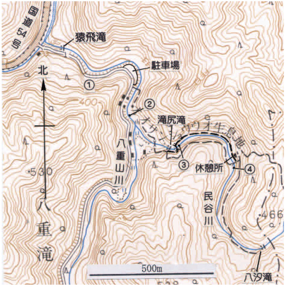 [みどころ | 交通 | 関連情報 | 指定 | 地質学的な意義] みどころ雲南市には竜頭(りゅうず)ケ滝、雲(くも)見(み)の滝、矢入り大滝など有名な滝がありますが、八重滝が最も水量が多いので見応えがある滝でしょう。1990年には龍頭が滝とともに日本の滝百選に選ばれている名瀑です。八重滝という名前の滝はありません。約2kmの間に大小8つの滝があるので、その区間を八重滝とよんでいるのです。8つの滝は下流より、猿飛(さるとび)滝、滝(たき)尻(じり)滝、紅葉(もみじ)滝、河鹿(かじか)滝、姥(うば)滝、姫(ひめ)滝、八(や)塩(しお)滝、八(や)汐(しお)滝とよばれていますが、八塩滝と八汐滝は一番奥にある落差40mほどの二段の滝で、上を八汐滝、下を八塩滝とよびます。また、猿飛滝は駐車場より下流にあります。 この内で見応えのあるのは、滝尻滝、八汐滝、八塩滝でしょう。残りの5つは落差数m以下の滝で、川底の一部だけに段差ができているものもあります。でも、そのような滝の下流では流れに渦ができやすいため、川底の岩盤に直径数10cm~数mの丸い窪みがつくられています。これは水の渦によって川底の砂利や玉石が回転して岩盤を削ってつくった穴で、ポットホール(甌(おう)穴(けつ))といいます。地点(3)では直径4mのポットホールがあります。