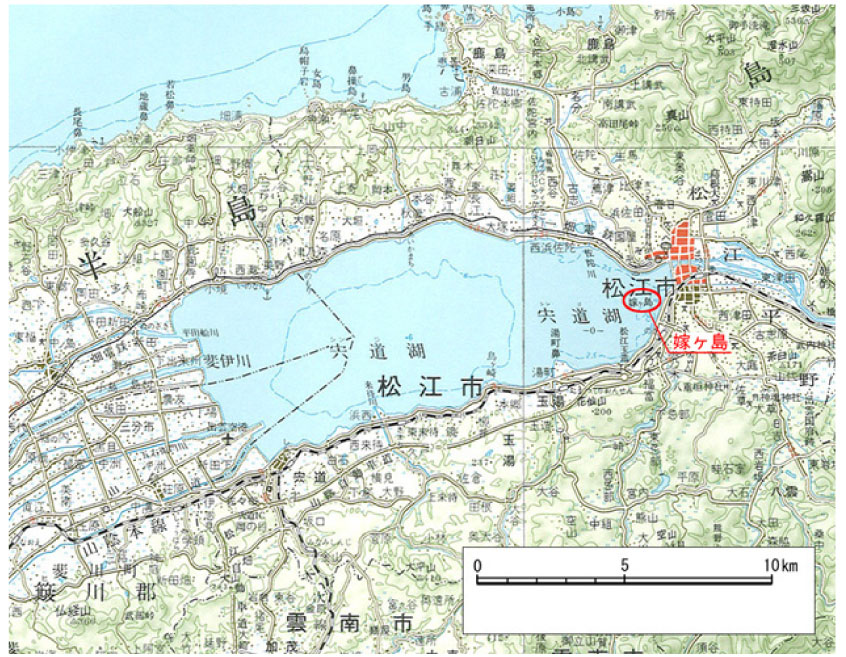 [みどころ | 交通 | 関連情報 | 指定 | 地質学的な意義] みどころ宍道湖は日本国内で7番目の面積を持ち、周囲長47kmで東西に長い長方形をしており、最大水深は6.4mで面積の割りに非常に浅い湖といえます。美しい夕日とともにさまざまな水辺の景観を作り出して、古来文人・墨客を魅了するとともに、漁業、水運、水利などで地域の人々の生活と密接な関係を持ってきました。 宍道湖は氷河時代の海面低下時には陸地であり、海面上昇により海の内湾となり、斐伊川からの土砂により出雲市側が埋められて一時的に淡水湖となった後、大橋川、佐陀川の開削により海水の混じった現在の汽水湖となりました。汽水湖の特性より、あまさぎ、白魚など「宍道湖七珍」といわれる水産物に恵まれており、特にしじみは全国生産量の約4割を占めており有名です。また宍道湖は国内有数の水鳥飛来地で240種以上の鳥類が生息しており、その生態環境を守るため平成17年に中海とともにラムサール条約に登録されました。 嫁ヶ島は宍道湖に浮かぶ唯一の島で、松江市街の南西部、袖師町沖約200mにあり、全長110m、幅約30mの小さな島です。松が点在する平坦な形で竹生島神社の小さな祠が祭られており、その位置より宍道湖夕景の絶好の添景となり多くの人に親しまれています。嫁ヶ島を構成する岩石は約1200万年前に噴出した玄武岩の溶岩からなっており、江戸時代初期までは対岸の袖師に連続した玄武岩の岬がありましたが、松江城築造に伴う石材として掘削され岬が無くなったと伝えられています。今でも湖岸より島へ歩いて渡れる道状の浅瀬がありますが、玄武岩の掘削跡かもしれません。