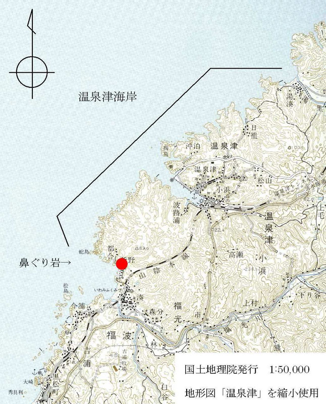 温泉津海岸の地質は、新第三紀中新世中頃に噴出した流紋岩と同質火砕岩が大部分を占めて分布しているほか、火山活動の休止期に堆積したと思われる泥岩・砂岩互層が分布しています。この互層の分布域では、一時的であるにせよ静かな環境で砂やシルト、粘土が堆積したと思われ、よく整合した堆積面が見られます。小さな水の流れによって駒の底のような堆積面がきれいに配列している様子もうかがえます。 アクセス車利用では出雲方面からは国道9号より温泉津交差点右折。JR温泉津駅から小型バスで温泉津港 5分。 関連する情報温泉津町観光協会: 天然記念物などの指定情報特にないですが、江戸時代の温泉津港繁栄の証として海岸線沿いの鼻ぐり岩の存在。 地質学的な意義本地域の地質は、新第三紀中新世の久利層に属する流紋岩~流紋岩質火砕岩が分布しています。(一部湯里湾周辺では安山岩~安山岩質火砕岩が分布しています)これらの岩石は、細粒均質で白色~淡灰色を呈しています。噴出堆積するときの熱水による変質作用によって既存の鉱物が絹雲母やカオリナイトなどの白色粘土鉱物に変化したためです。また、同じ熱水作用で岩石は珪化されており、緻密質で堅硬になっています。このため風化や浸食に対して比較的強く、ごつごつした岩肌や険阻な海岸地形を形成する原因のひとつになっています。 |